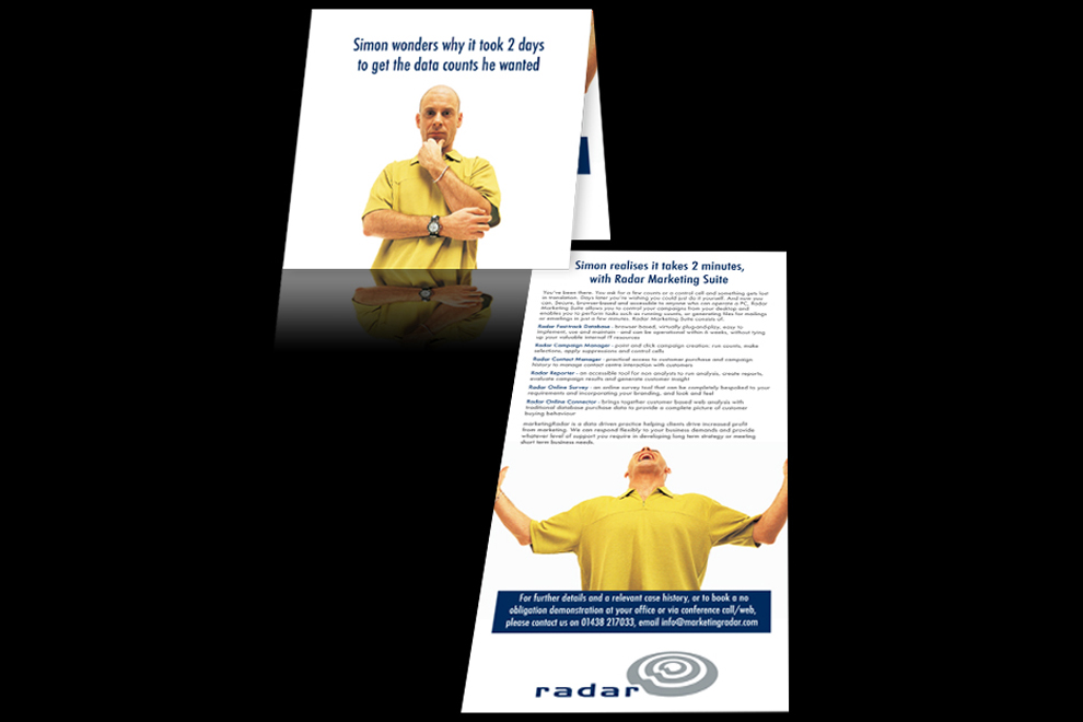 Knowing we would have to sell the IT advantages of the product to a mostly non-technical audience, we developed a ‘frustration’ concept to cut through the technical explanations straight to powerful, simple business benefits. Emailings supported the direct mail and a follow-up brochure gave more detail to respondents, as well as a full explanation of each element of the Radar Marketing Suite.